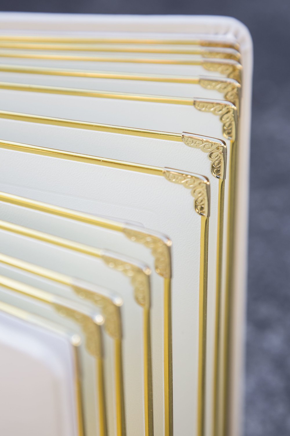 The inside covers are lined with quality silk moiré fabric.  Each page is protected by reinforced edging and ornate metal corner pieces.