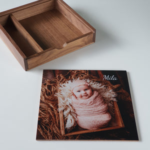 Lid options: WOOD or ACRYLIC. Wood is great for printing names and dates, your logo or a special message. It's printed directly onto the wood lid. You can also print a photo on the wooden lid if you want a textured finish.** The acrylic lid is perfect for photos if you are looking for a smooth, crisp finish. Your photo is printed behind the acrylic, so it's protected. You can also select the acrylic lid for logos, names & dates, birth details or messages. If you don't want the white background, please add a note at checkout.